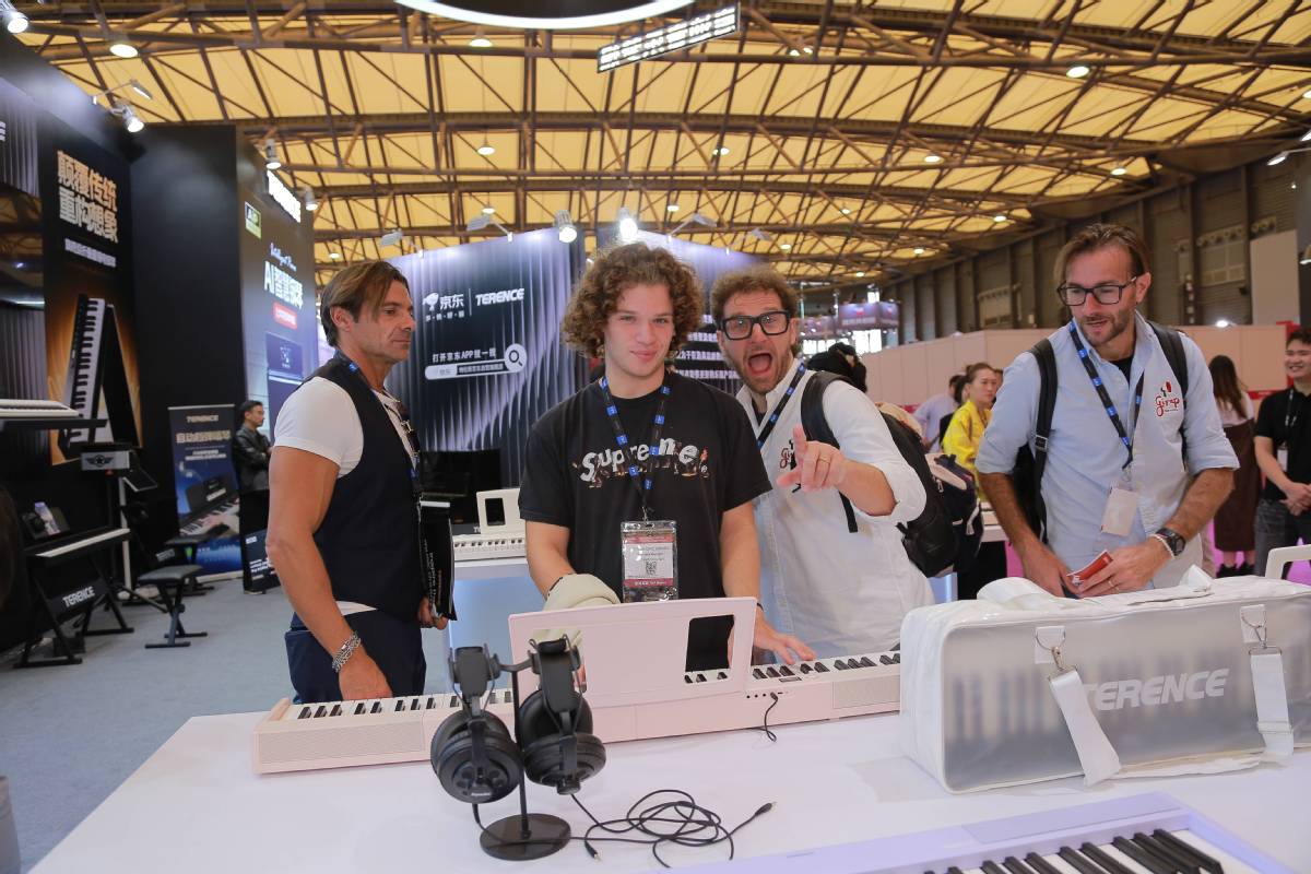 在展會現場,特倫斯展廳人氣火爆,觀眾們紛紛駐足欣賞這些創新產品。特倫斯品牌的工作人員也積極向觀眾介紹產品的特點和優勢,并邀請現場觀眾試彈,感受折疊電鋼琴的獨特魅力。許多觀眾在試彈后,都對特倫斯折疊電鋼琴的音質和手感表示贊賞,認為這類型的產品不僅適合初學者,也適合專業樂手使用。